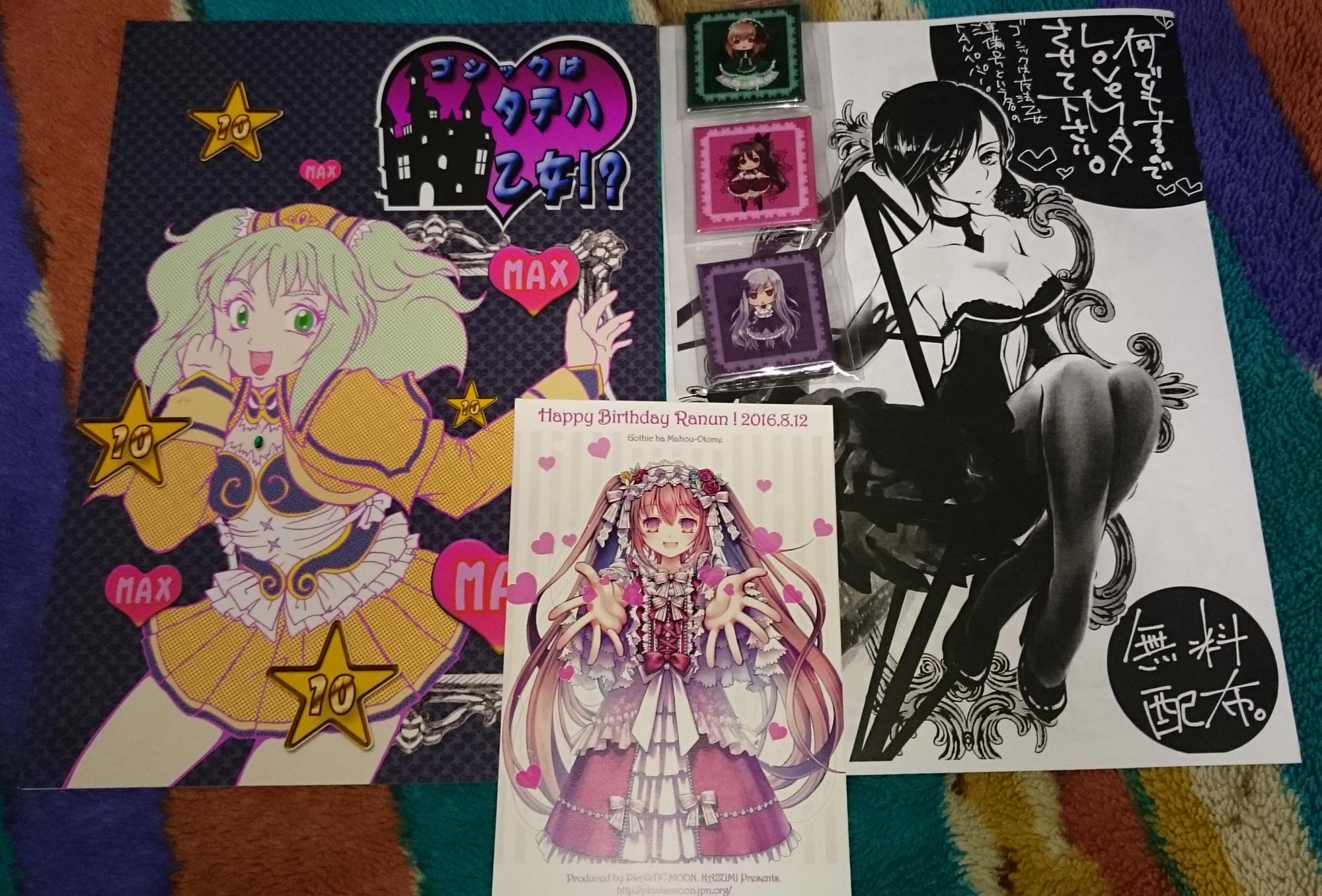 「四号団」さんのろりかわ缶バッジセットと配布ペーパー。